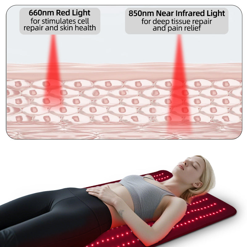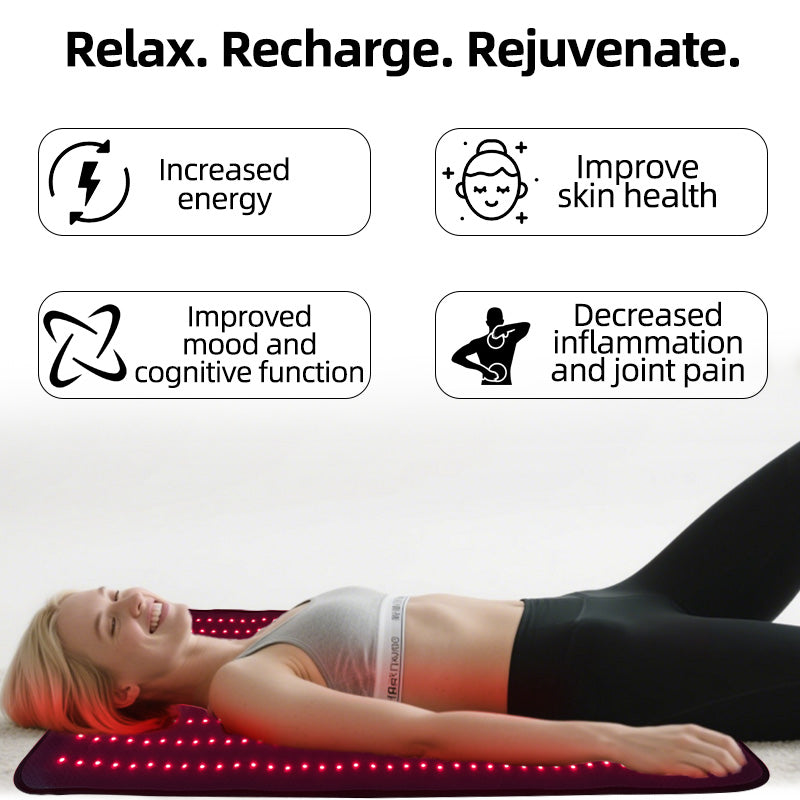 This professional red light therapy mat is engineered with a dual-chip system that delivers 660nm red light and 850nm near-infrared light—two wavelengths extensively validated in clinical studies for their ability to stimulate mitochondrial activity and enhance cellular energy (ATP) production. It features three selectable light modes: red, infrared, and a combined setting, allowing tailored treatments for specific therapeutic goals. Designed for safe and effective home use, this device supports a wide range of wellness applications, including skin rejuvenation, pain management, muscle recovery, improved sleep quality, and mood regulation.