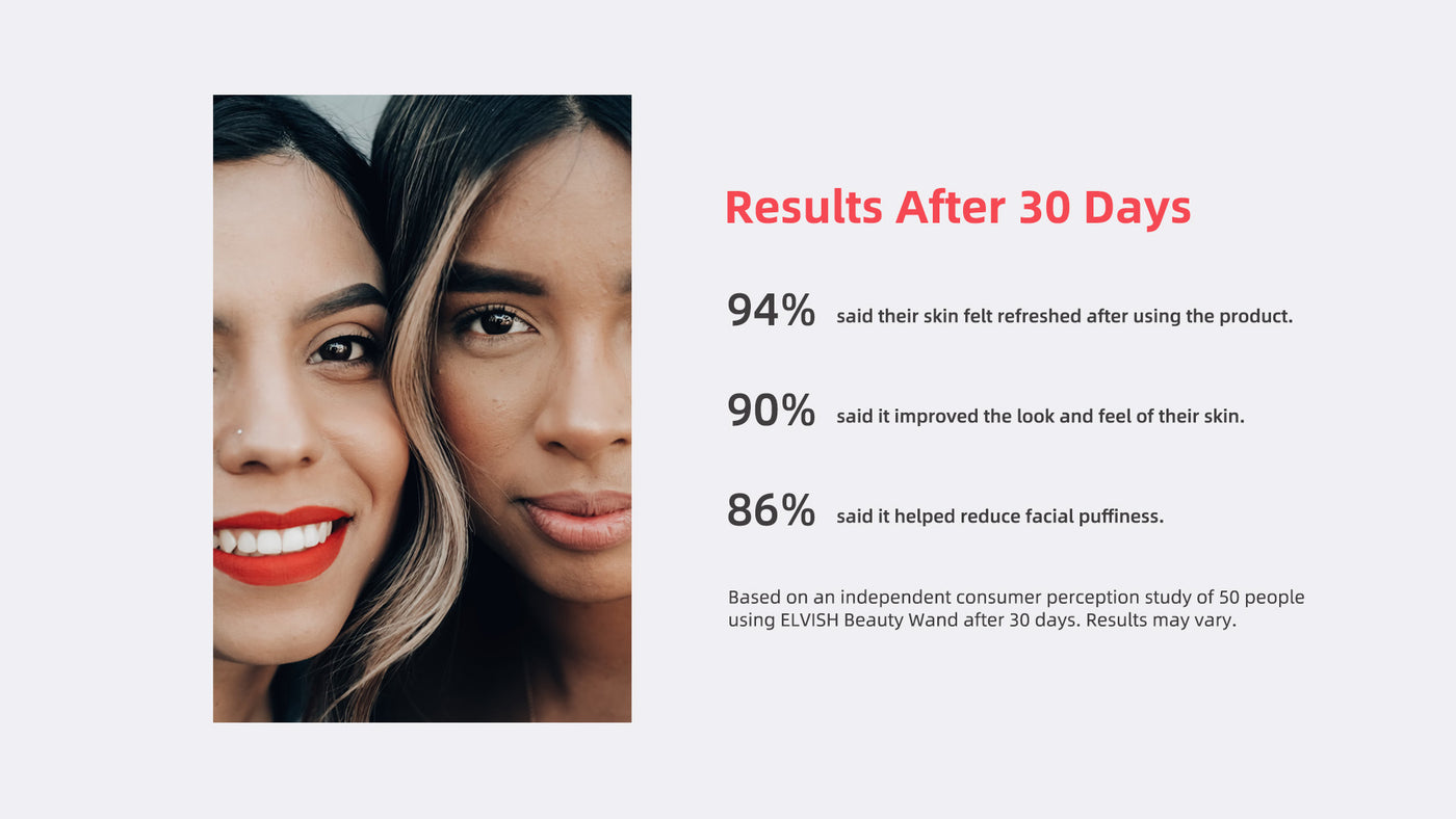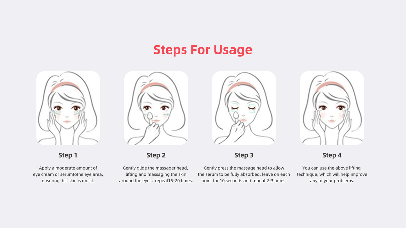 This device has a variety of beauty benefits that are noticeable over time. Most users notice plumper, smoother skin, less dark circles, and an overall more radiant complexion in the first few weeks of use. After a few weeks of regular use, wrinkles and fine lines are reduced. Most users see results within 3 weeks, but individual experience varies. For best results, glide the device inward and outward motions over the face daily, 3 minutes per area, for a total of 12 minutes. Combine with a serum or any oil-free serum with conductive ingredients for enhanced results.