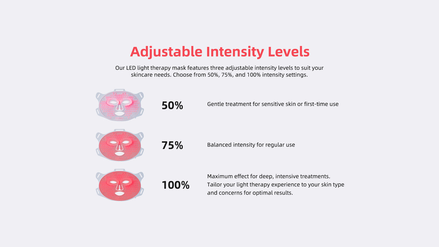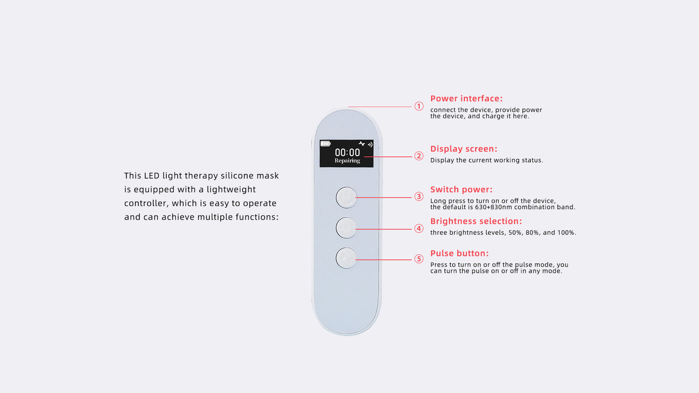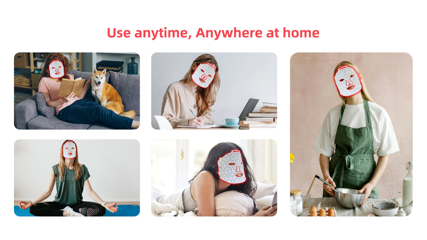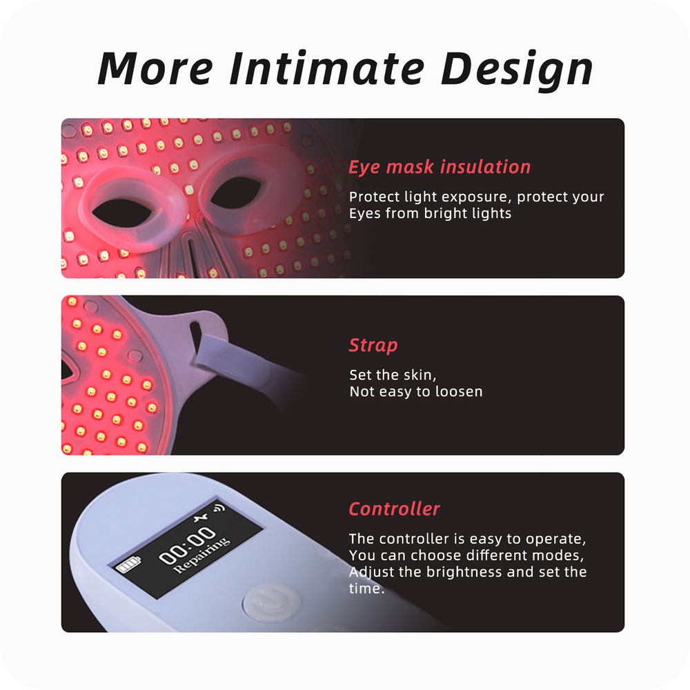 It has a total of 66 high-quality LEDs. Each LED emits 4 different wavelengths (Blue light 415nm, Yellow light 590nm, Red light 660nm, and Near-infrared light 850nm), and can be adjusted by the controller to emit 3 different energies.Based on the theory of phototherapy,the light wave irradiation of this product is more beneficial to penetrate into the skin,stimulating collagen and elastin to generate cells and achieve the effect of skin beauty.